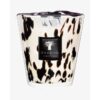 The scented candle is set in a hand blown glass replicating grey marble with black strokes edged with beige. The elegance of the glass reveals the flame, giving an effect of a luminous stone